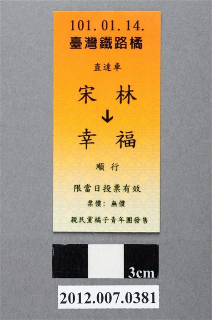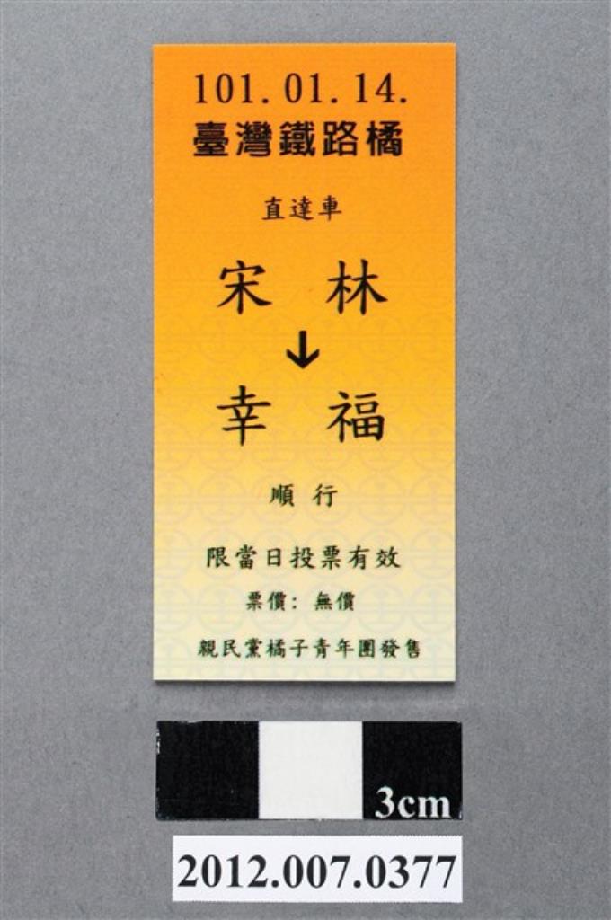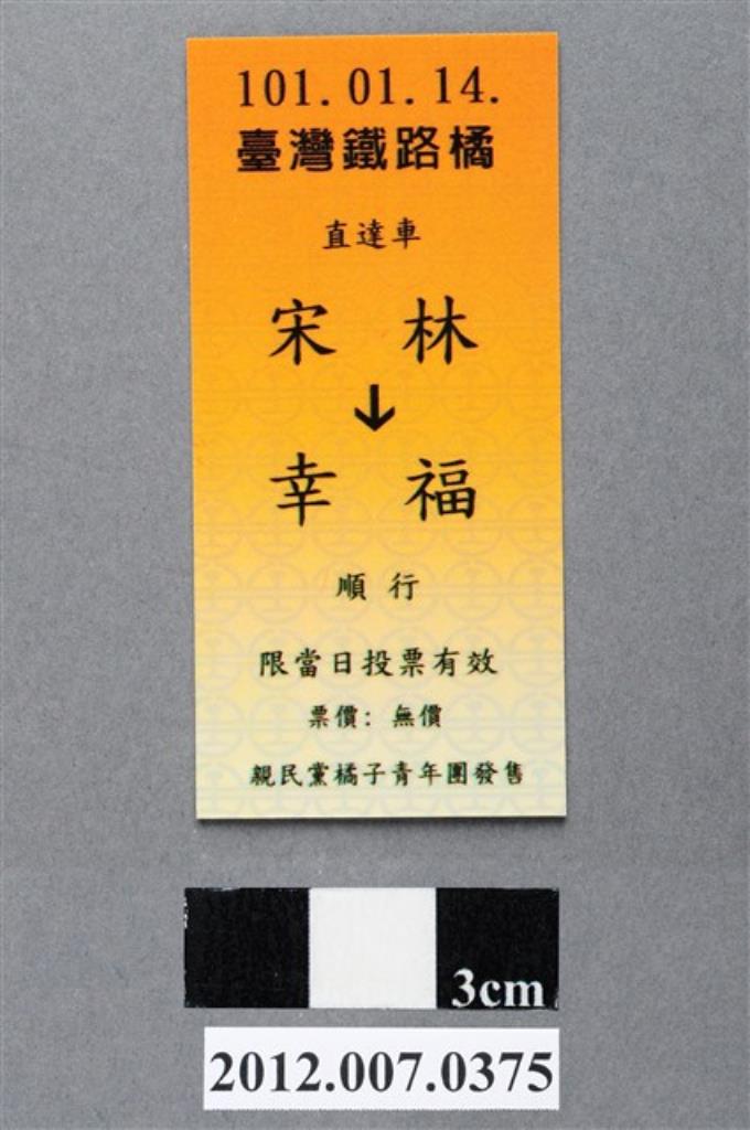 中華民國第13屆總統選舉候選人宋楚瑜與林瑞雄「宋林幸福」車票競選宣傳品