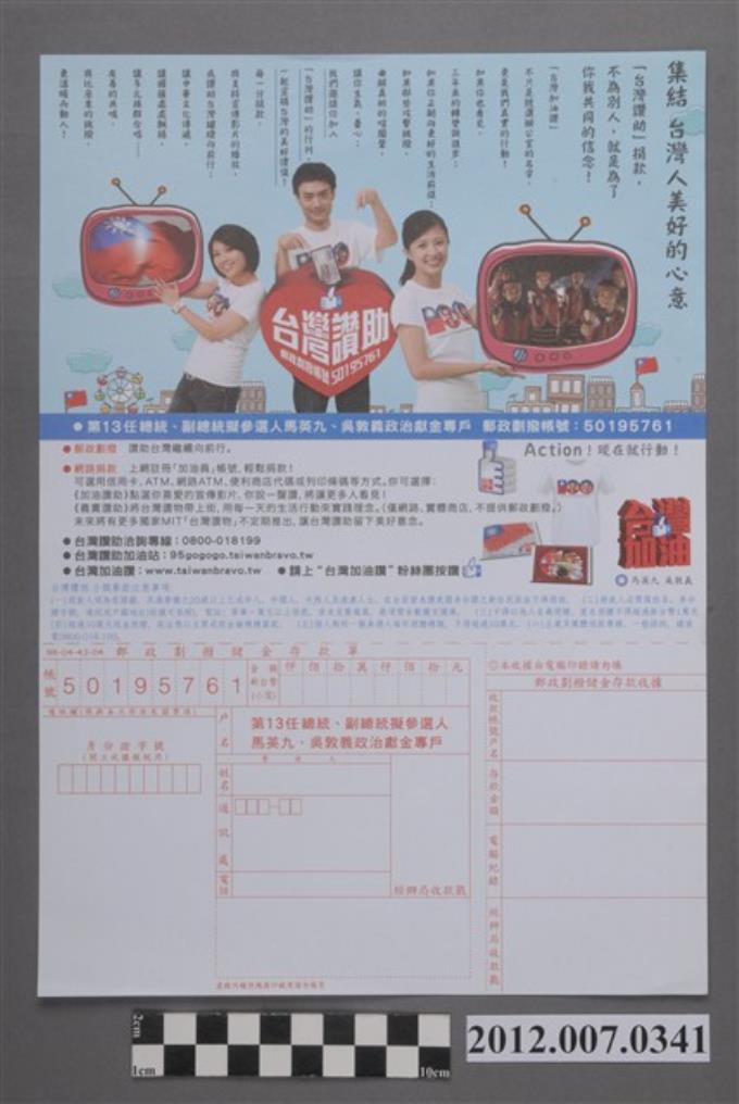 中華民國第13屆總統選舉候選人馬英九與吳敦義「臺灣讚助」政治獻金專戶宣傳單