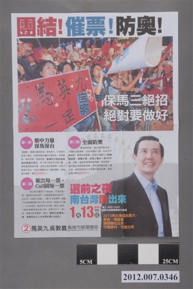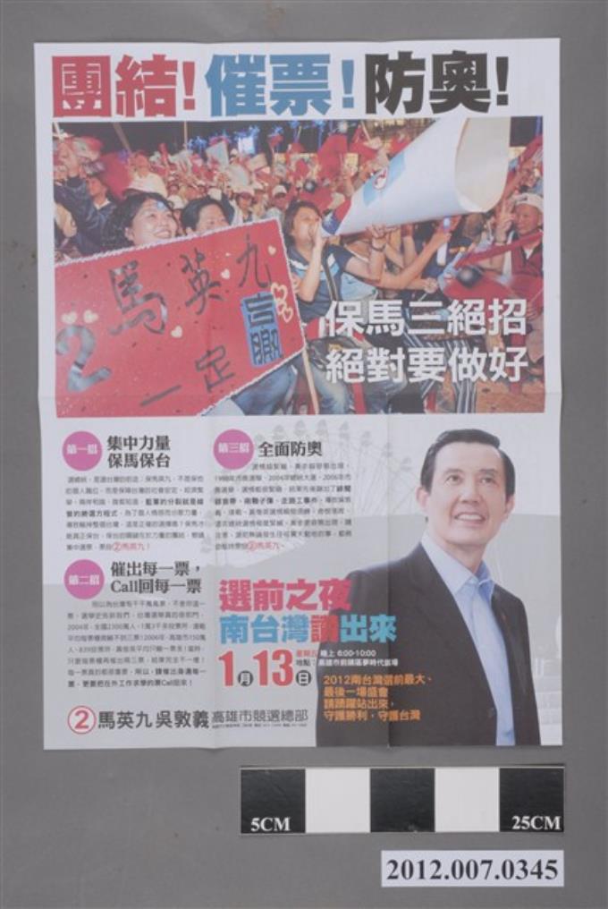 中華民國第13屆總統選舉候選人馬英九與吳敦義「團結!催票!防奧!」競選文宣