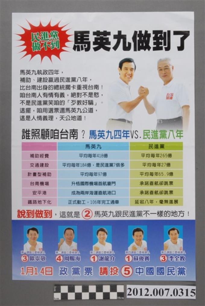 中華民國第13屆總統選舉候選人馬英九與吳敦義「對臺南的建設」競選文宣