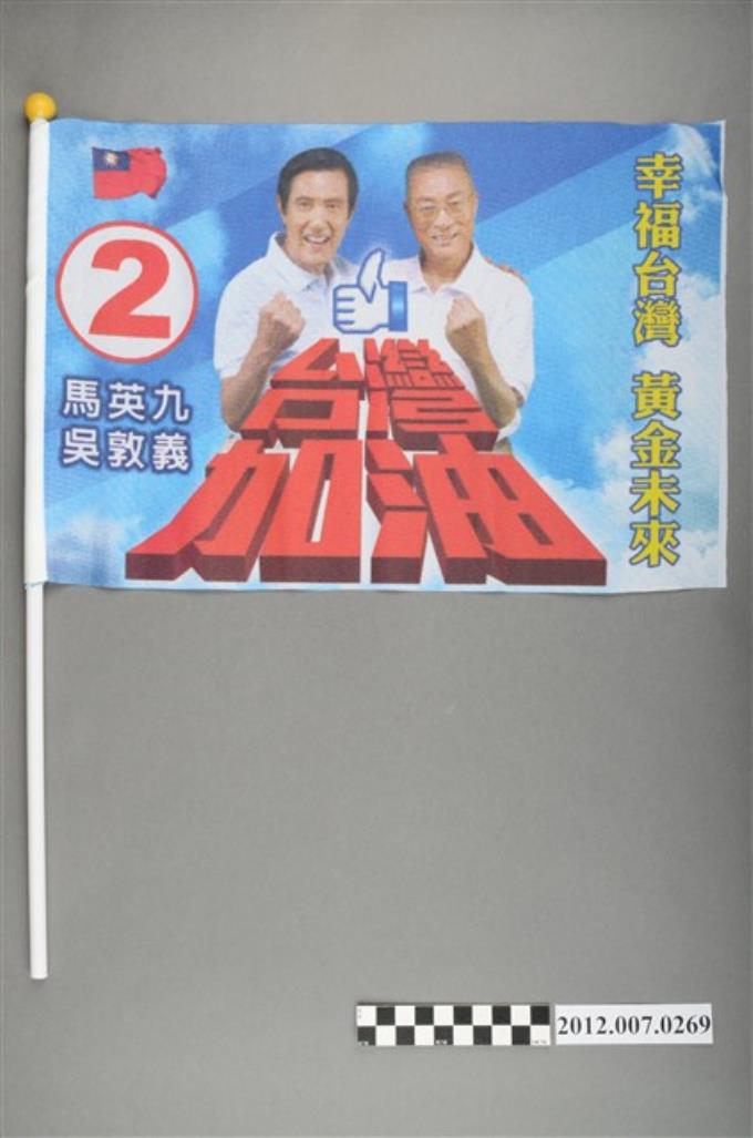 中華民國第13屆總統選舉候選人馬英九與吳敦義「臺灣加油讚 幸福臺灣」競選宣傳旗幟