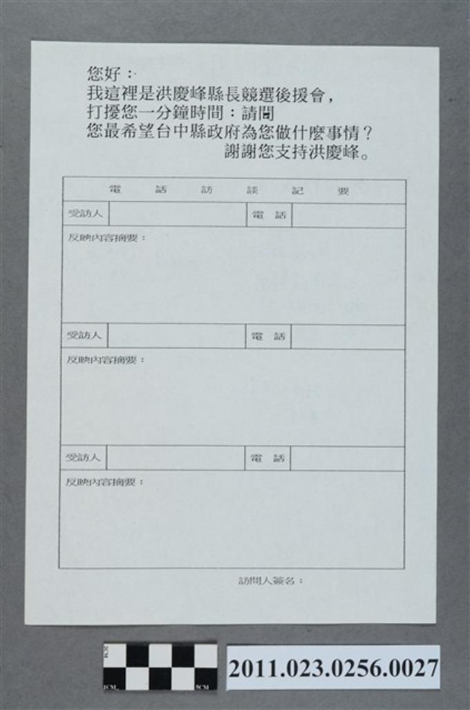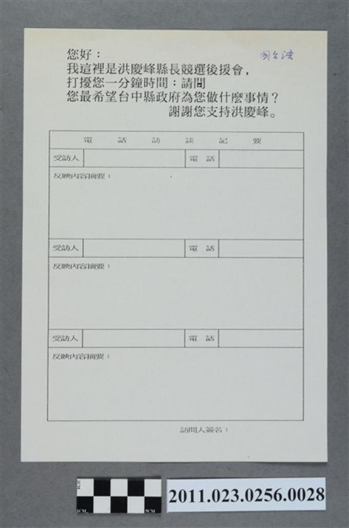 洪慶峰1998年提名登記參選國民黨臺中縣長候選人電話訪談問卷背面記事國台語版