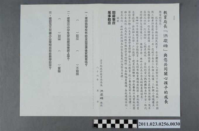 洪慶峰1997年競選文宣「教育局長(洪慶峰)與您共同關心孩子的成長」致溪南國中家長問卷信封