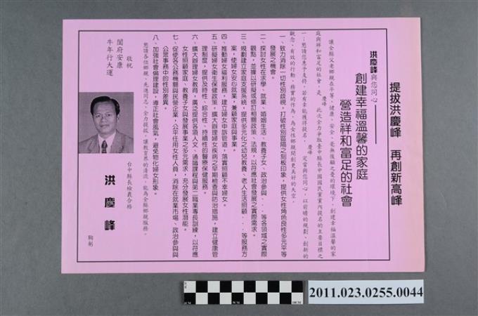 洪慶峰1997年競選政見文宣「創建幸福溫馨的家庭 營造祥和富足的社會」