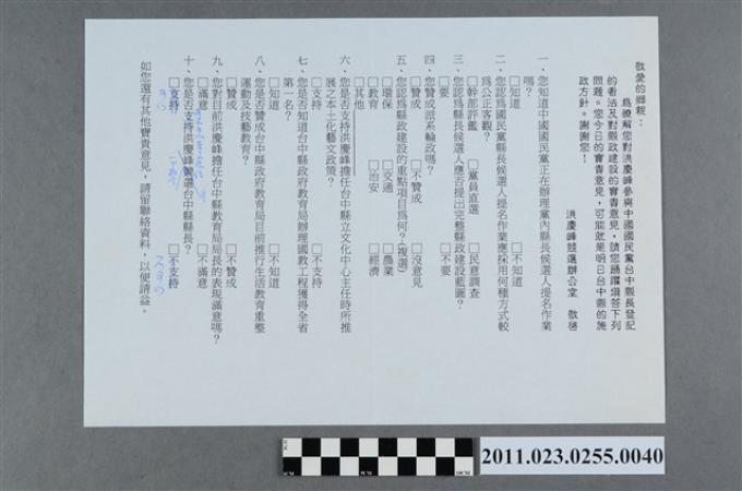 洪慶峰1997年提名登記國民黨臺中縣長候選人調查問卷