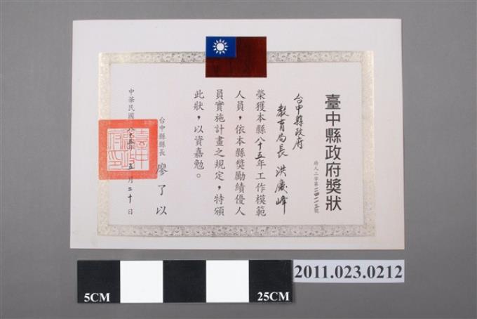 洪慶峰臺中縣政府1996年工作模範人員獎狀