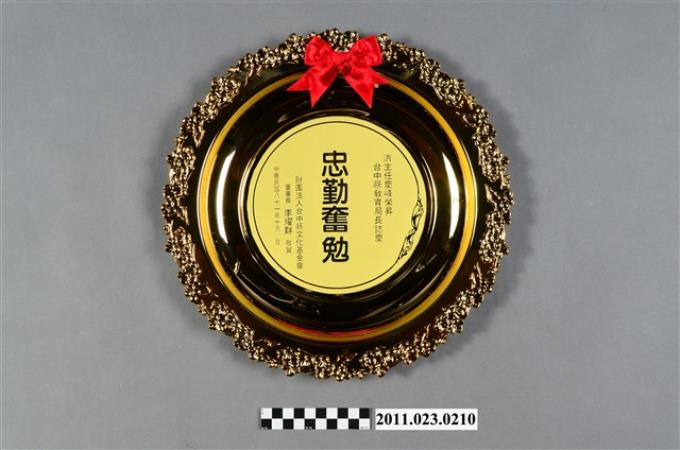 洪慶峰臺中縣文化基金會升任臺中縣教育局長「忠勤奮勉」紀念金盤