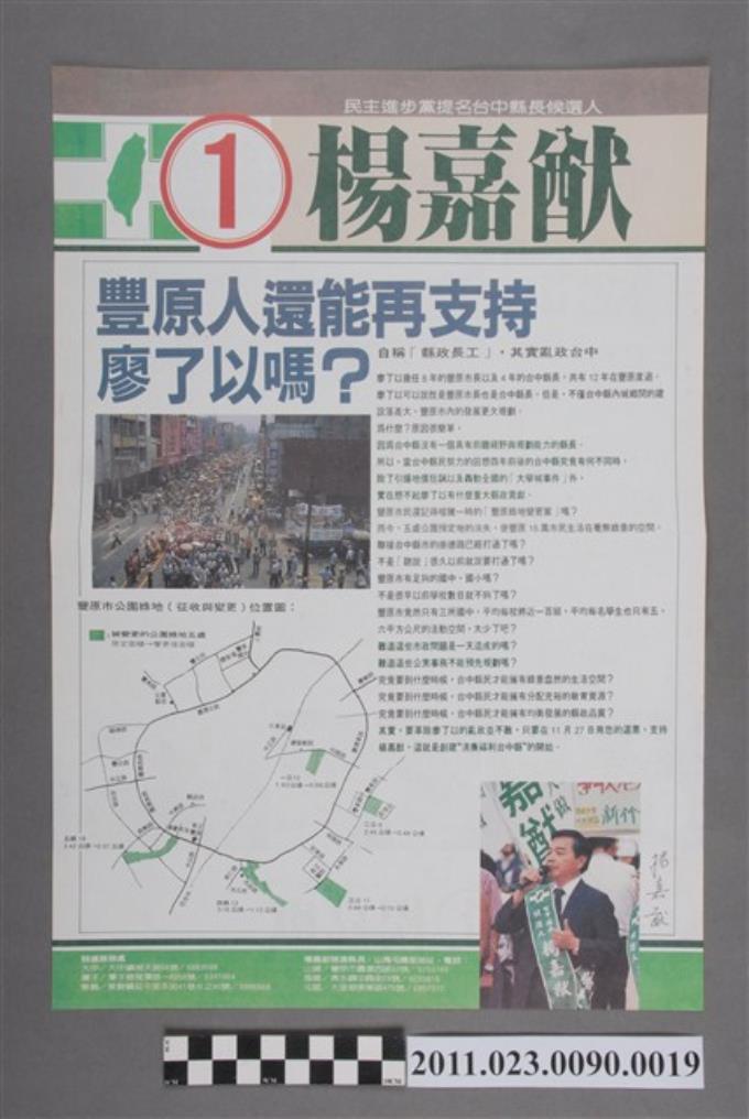 楊嘉猷1993年競選第12任臺中縣長負面文宣傳單「豐原人還能再支持廖了以嗎」