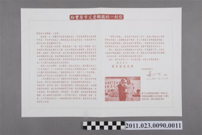 廖了以1993年競選第12任臺中縣長文宣傳單「廖一久給豐原市父老鄉親的一封信」