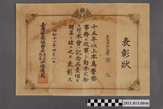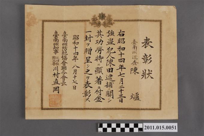 臺灣警察協會長平塚廣頒發給臺南州巡查陳爐之表彰狀