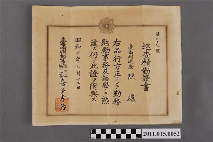 臺南州知事喜多孝治頒發給陳爐之第207號巡查精勤證書