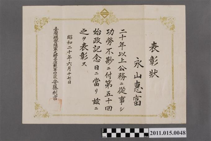 臺灣總督安藤利吉頒發給永山惠富之表彰狀