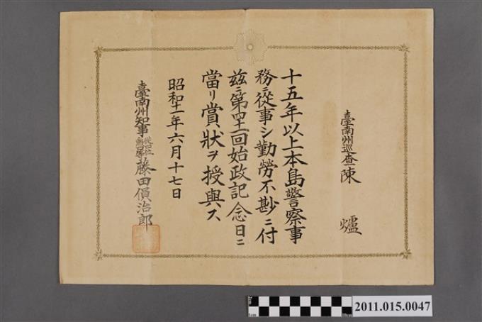 臺南州知事藤田傊治郎頒發給臺南州巡查陳爐之獎狀