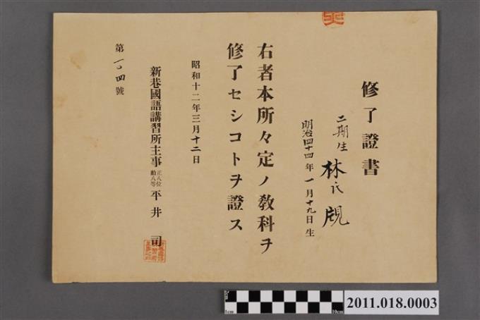 林覑新港國語講習所修業證書
