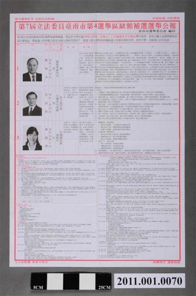 臺南市選舉委員會編印《第7屆立法委員臺南市第4選舉區缺額補選選舉公報》