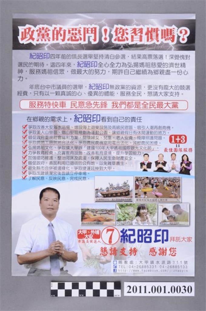 中華民國第1屆臺中市議員候選人紀昭印「政黨的惡鬥」選舉文宣