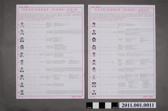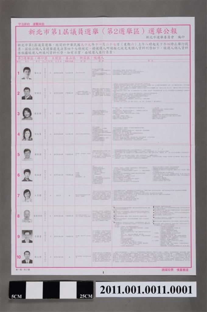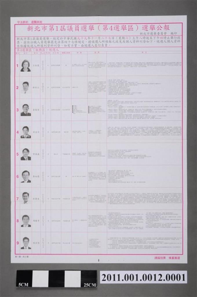 新北市選舉委員會編印《新北市第1屆議員選舉(第2選舉區)選舉公報》第1張