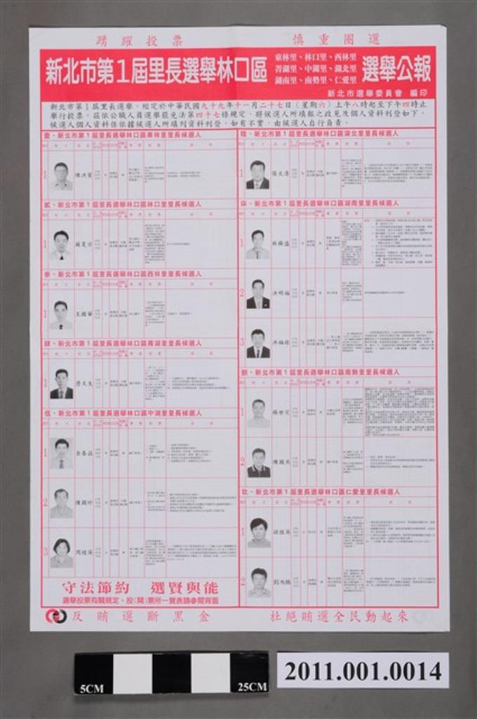 新北市選舉委員會編印《新北市第1屆里長選舉林口區東林里、林口里、西林里、菁湖里、中湖里、湖北里、湖南里、南勢里、仁愛里選舉公報》