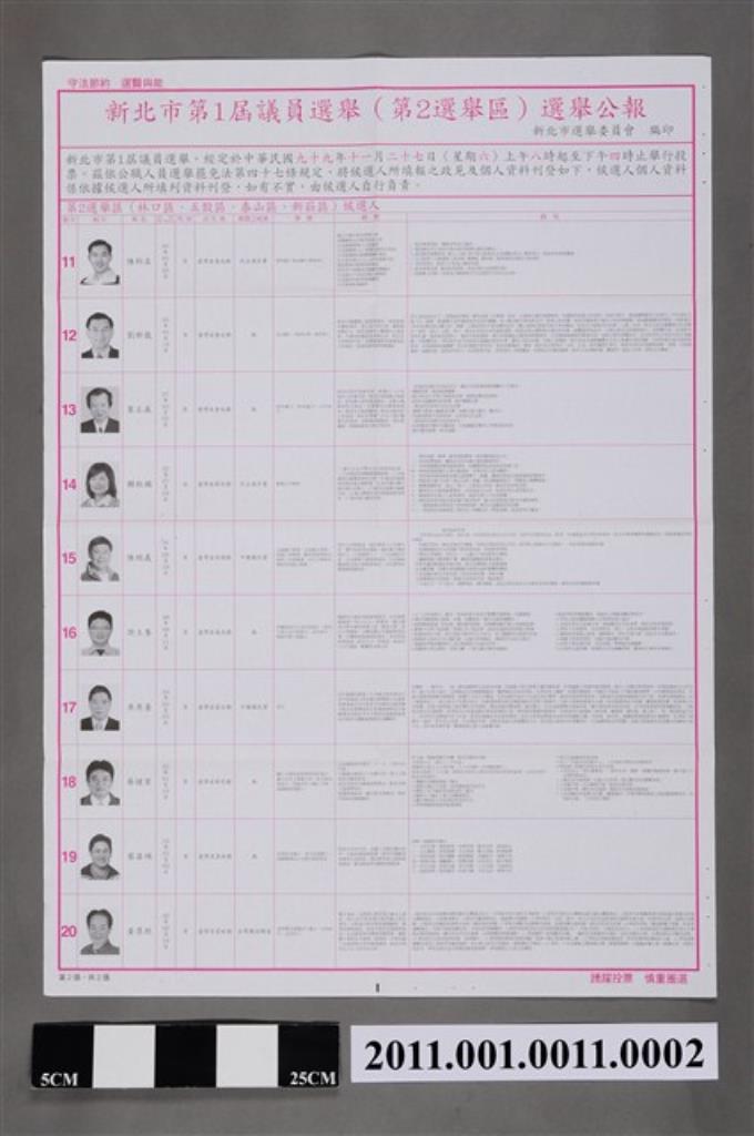 新北市選舉委員會編印《新北市第1屆議員選舉(第2選舉區)選舉公報》第2張