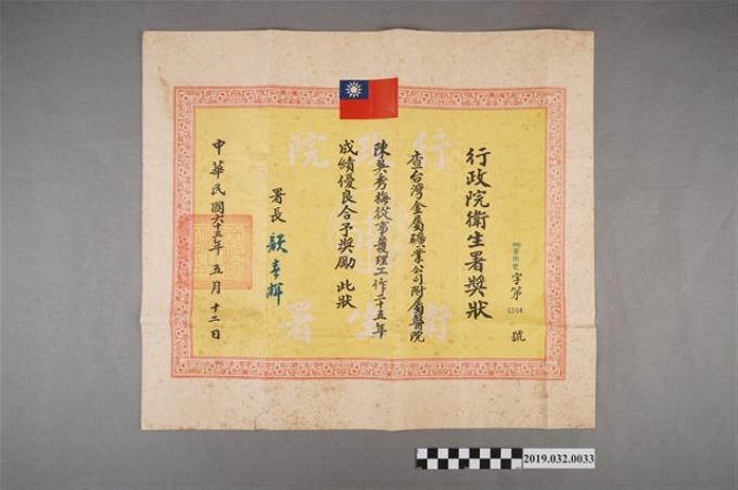 行政院衛生署頒陳吳秀梅工作25年獎狀