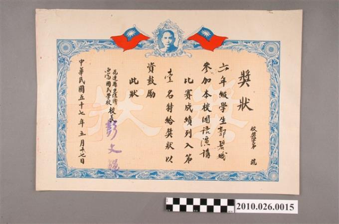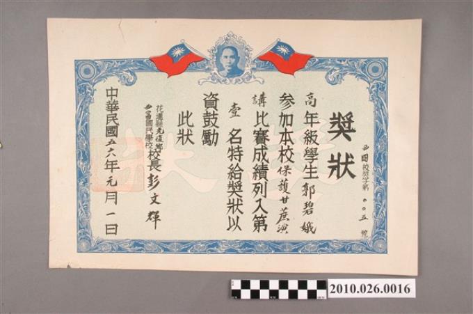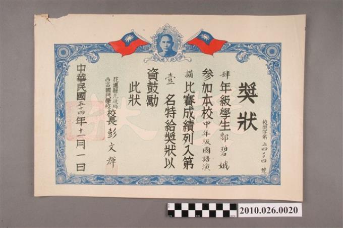 郭碧娥花蓮縣西富國民學校國語演講比賽獎狀