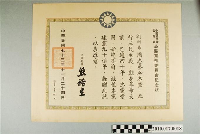 國民黨中央委員會頒發參加國民黨滿六十年之榮譽狀
