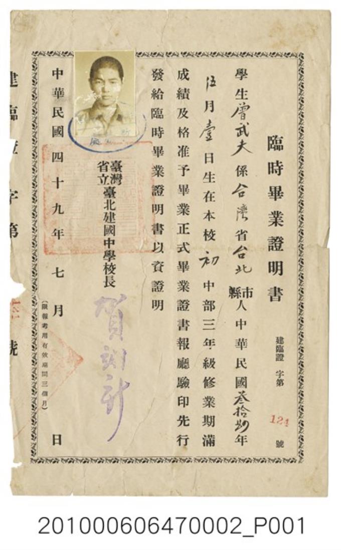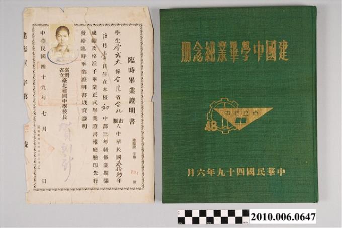 臺灣省立臺北建國中學畢業紀念冊及臨時畢業證書