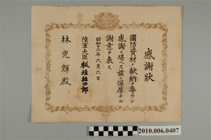 昭和十三年陸軍大臣板垣征四郎頒授與林光輝之感謝狀
