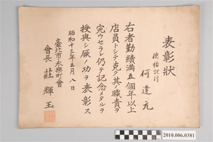 臺北市永樂町會會長莊輝玉給予德裕記行何逢元之表彰狀