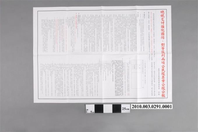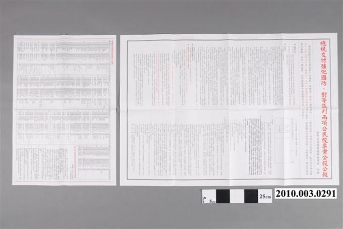 臺灣省宜蘭縣選舉委員會編印《總統交付強化國防、對等談判兩項公民投票案公投公報》