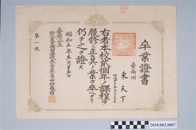 昭和3年東天下臺灣公立新化農業補習學校畢業證書