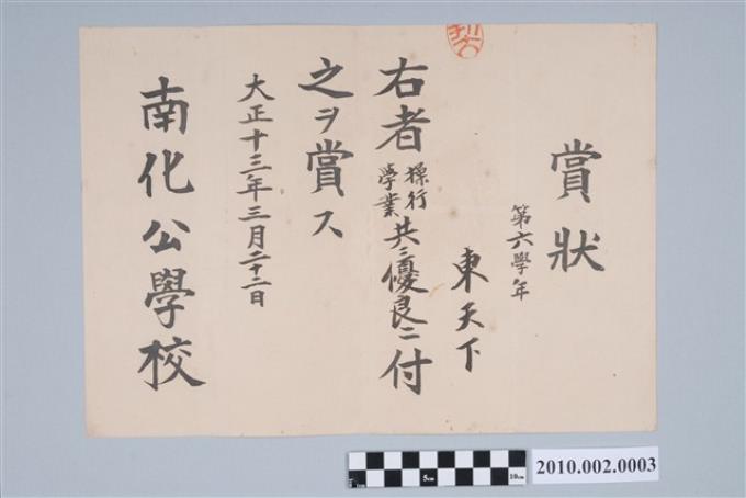 大正13年東天下南化公學校獎狀