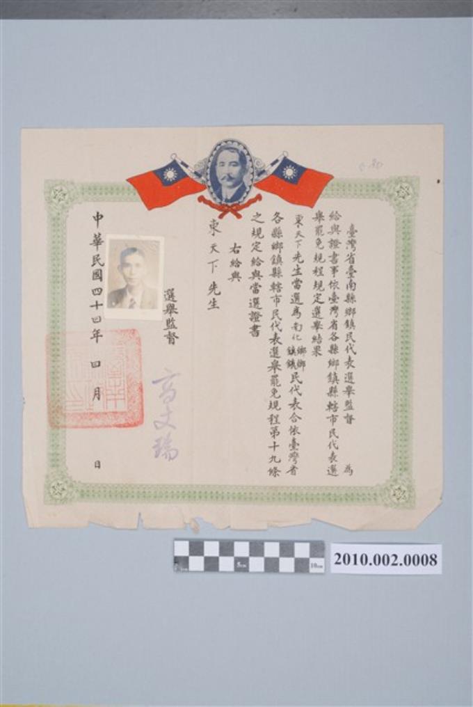 民國44年東天下南化鄉鄉民代表當選證明書