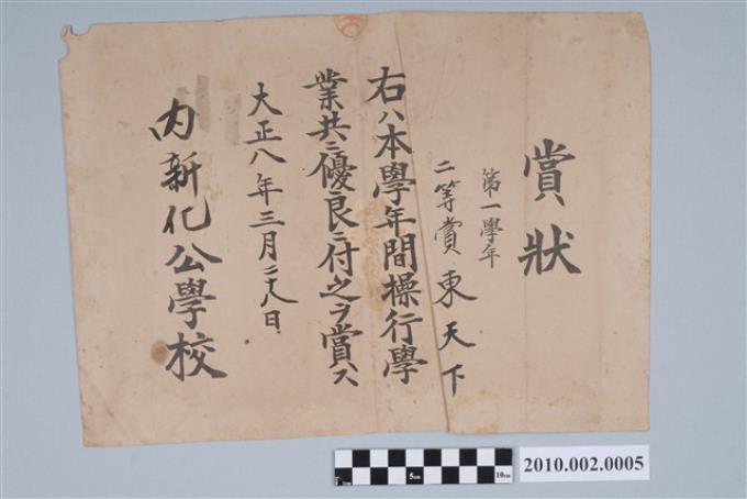 大正8年東天下內新化公學校獎狀