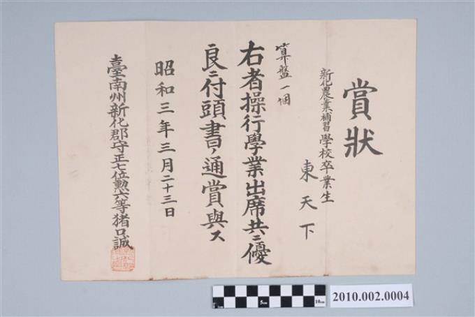 昭和3年東天下新化農業補習學校獎狀