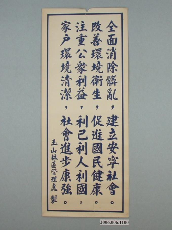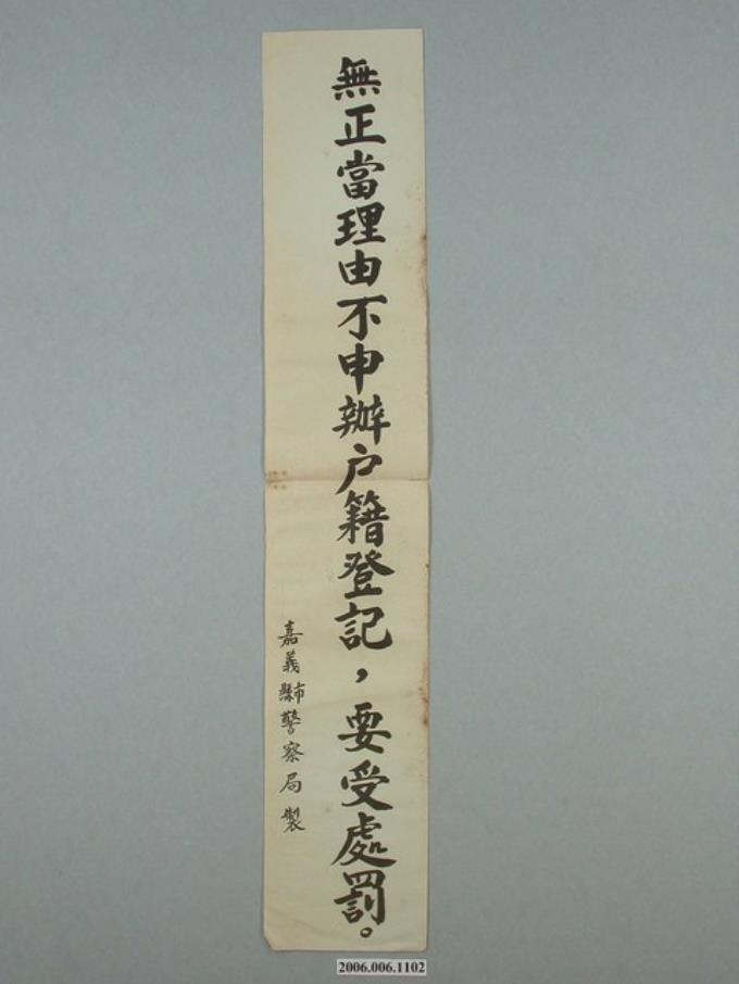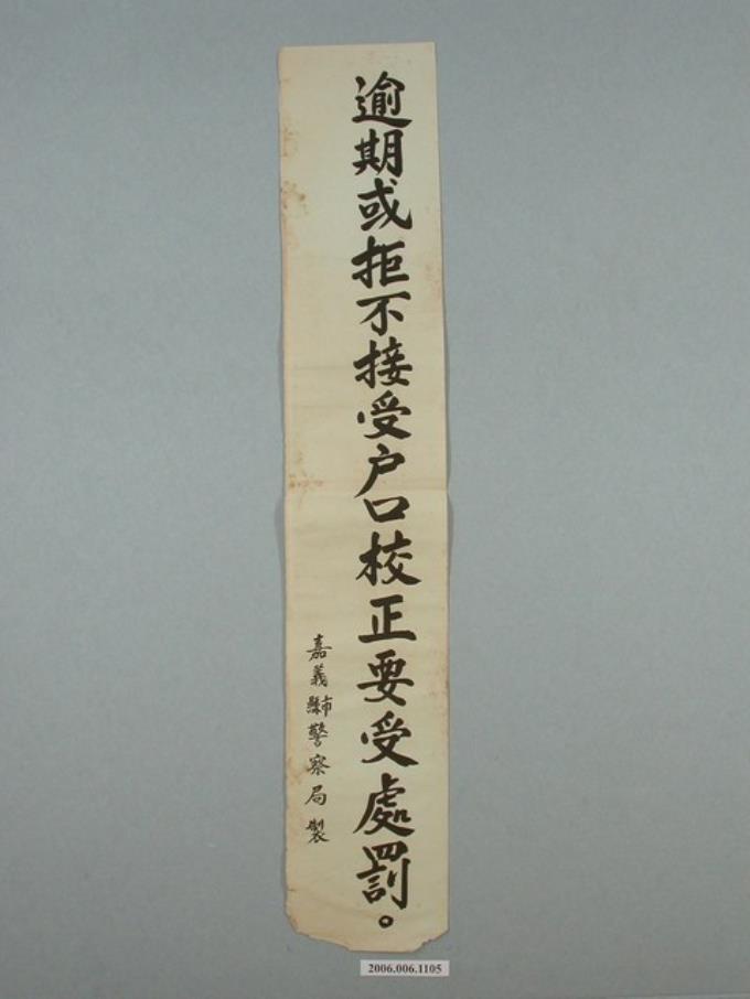 嘉義縣市警察局製「逾期或拒不接受戶口校正要受處罰。」標語