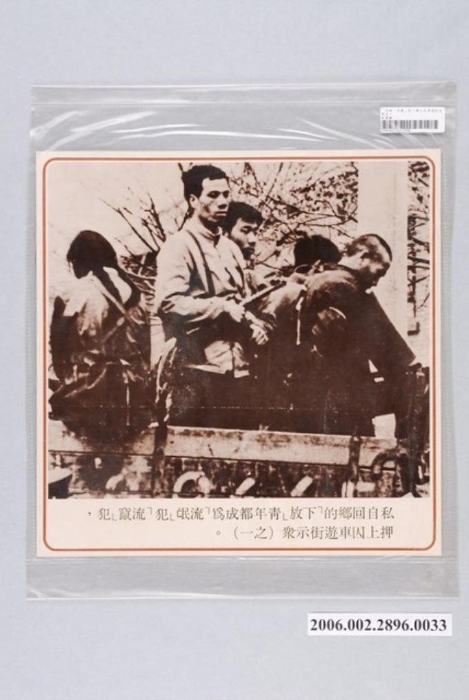 中國大陸災胞救濟總會印行《中國大陸共匪暴行》〈「流氓、流竄」犯押上囚車遊街示眾(之一)〉文宣