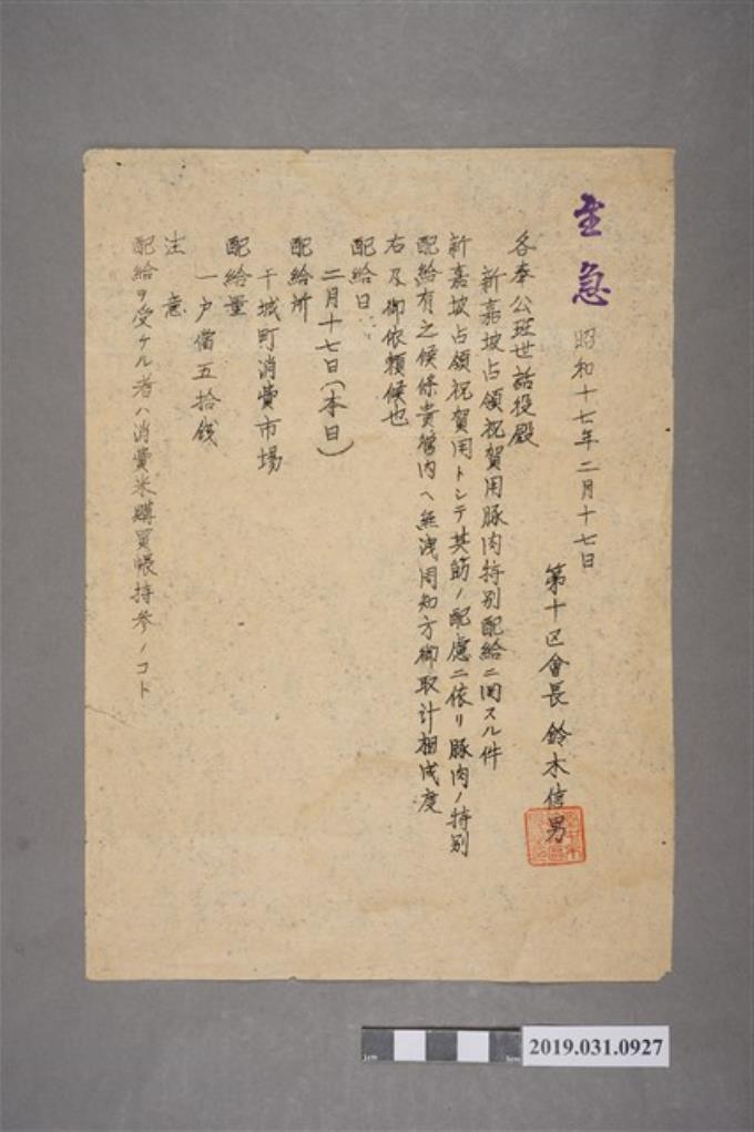 鈴木信男豚肉特別配給通知昭和十七年二月十七日