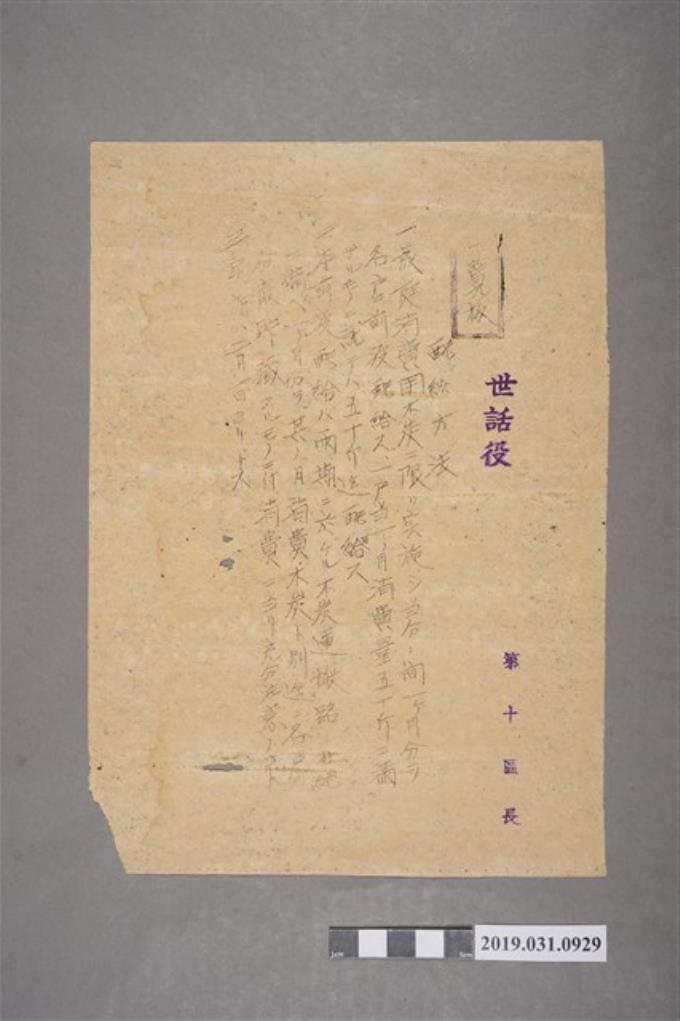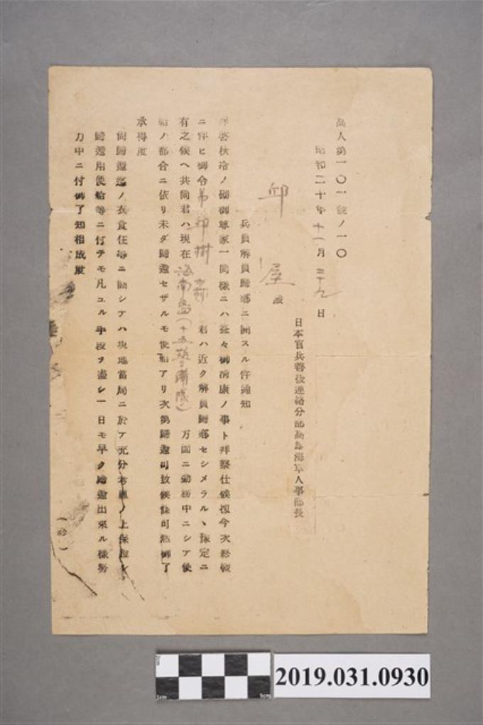 邱屋兵役返鄉通知昭和二十年十一月二十九日