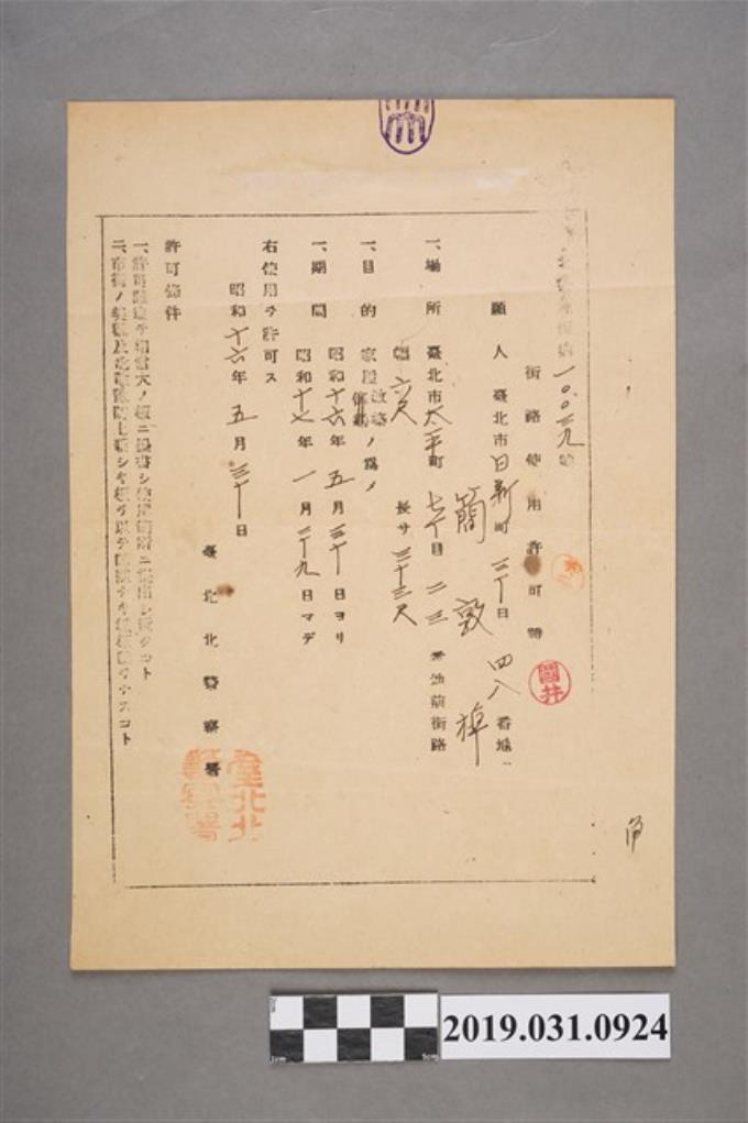 簡敦棹街路使用許可證昭和十六年五月三十日
