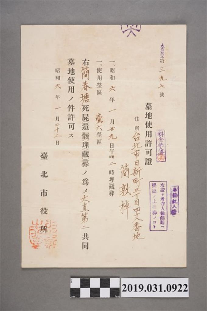 簡敦棹墓地使用許可證昭和六年一月二十二日