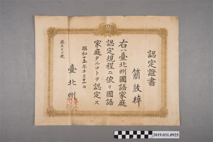簡敦棹國語家庭認定證書昭和十五年二月十一日