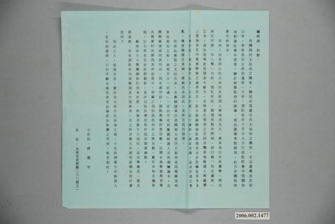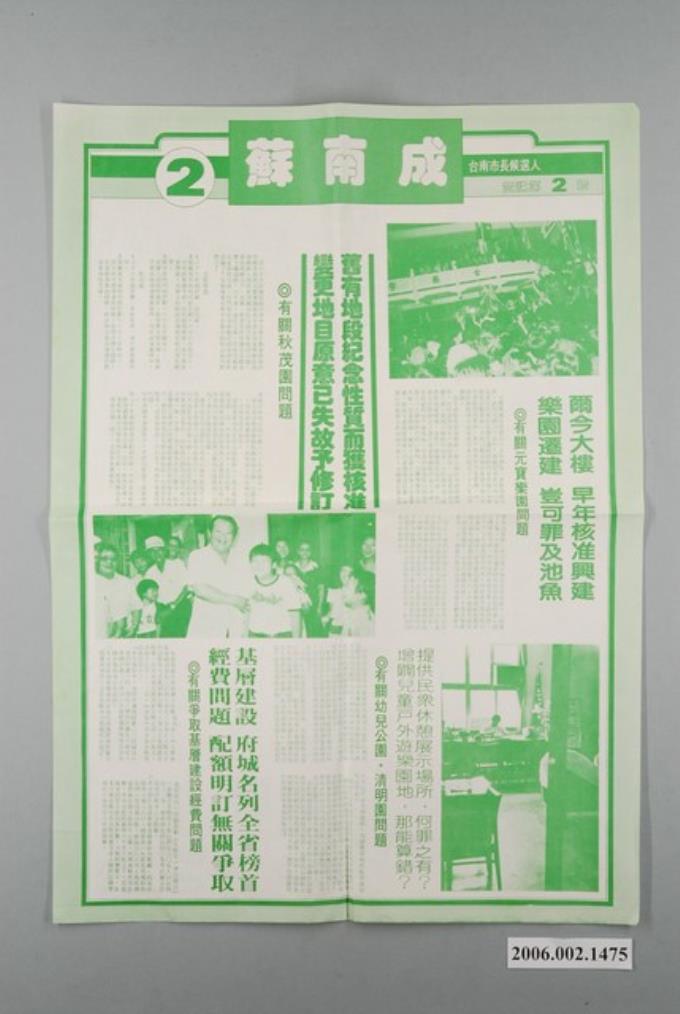 第9屆臺南市市長候選人蘇南成選舉宣傳單