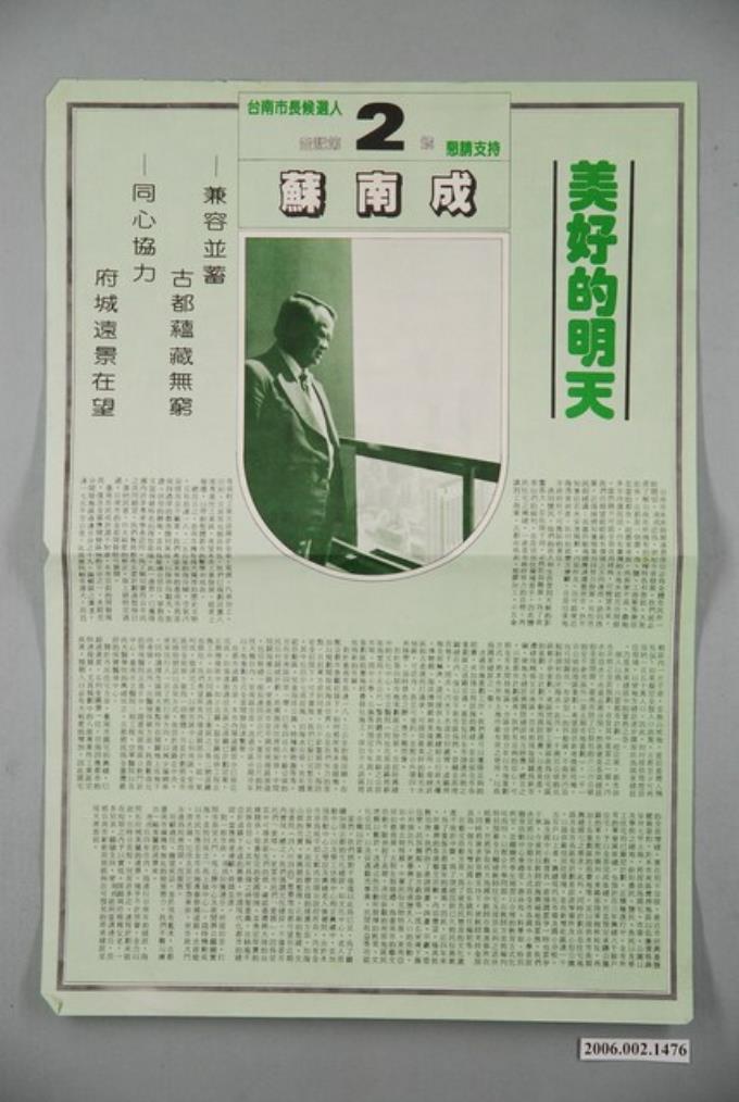 第9屆臺南市市長候選人蘇南成「美好的明天」選舉宣傳單