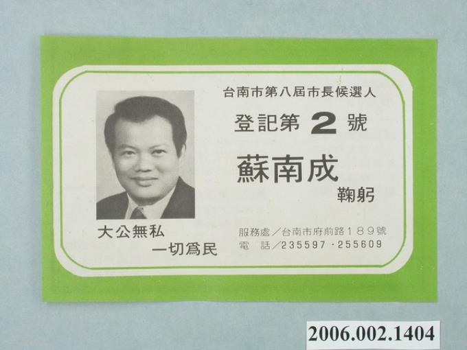 第8屆臺南市市長候選人蘇南成選舉宣傳單
