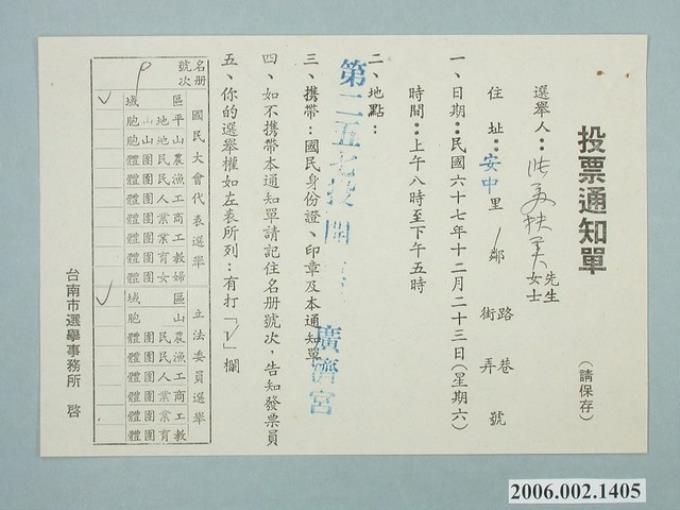 臺南市選舉事務所印行9號名冊《國民大會代表選舉 立法委員選舉投票通知單》