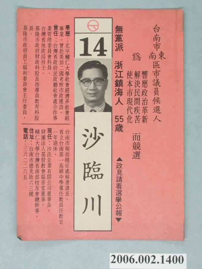 臺南市第9屆市議員候選人沙臨川選舉宣傳單