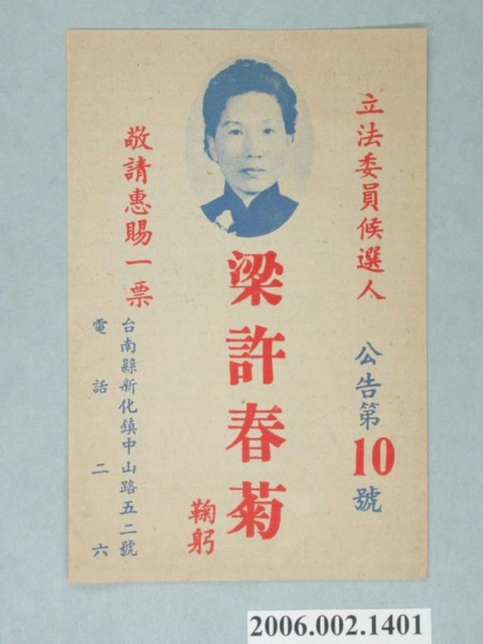 第1屆增額立法委員候選人梁許春菊選舉宣傳單