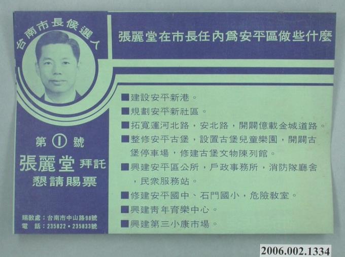 第8屆臺南市市長候選人張麗堂「張麗堂在市長任內為平安區做些什麼」選舉宣傳單