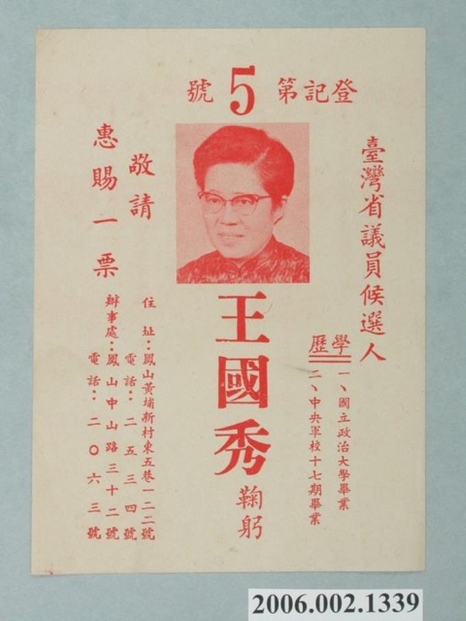 中華民國第4屆臺灣省議員候選人王國秀選舉宣傳單